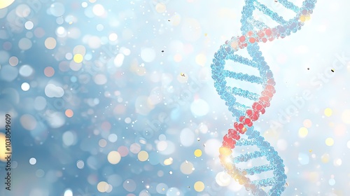 Blue double helix DNA with red and yellow circles floating around, featuring a light blue color theme and a clean design on a white background.
