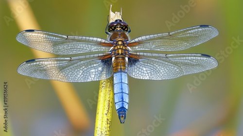 dragonfly, insect, blue, wing, yellow, stem, plant, nature, macro, photo, detail, animal, wildlife, fauna, invertebrate, arthropod, odonate, anisoptera, eye, head, chested, abdomen, leg, body, segmented, pattern, vein, texture, transparent, delicate, fragile, colours, vibrant, background, blurred, sharpened, sharp, beauty, wild, summer, field, green, light, shadow, perched, resting, gaze