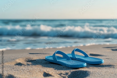 Blue Flip Flops on Sandy Beach with Ocean Waves Background