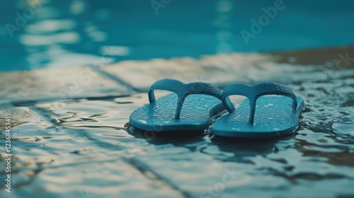 Blue Flip Flops Resting on Wet Poolside with Water Reflection