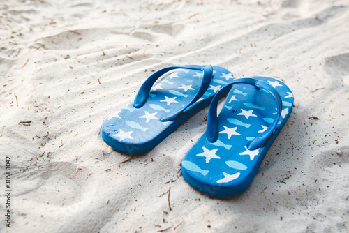 Blue flipflop shoes on white sand beach