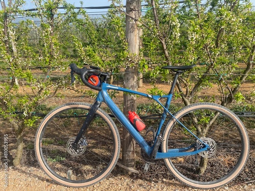 gravel, bike, bicycle, wheel, sport, ride, nobody, park, parked, nature, springtime, flower, fruit tree, field, agriculture, trip