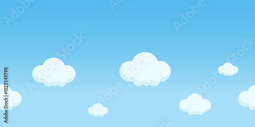 Blue horizontal background with white clouds. Patterned clear sky design for web banner, print, cover, decoration.