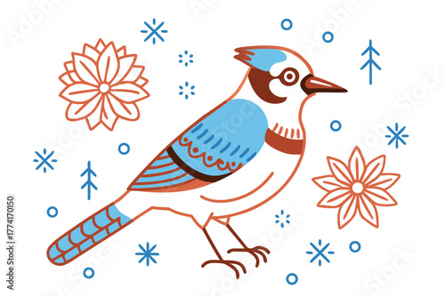 Blue jay bird illustration with floral and snow elements