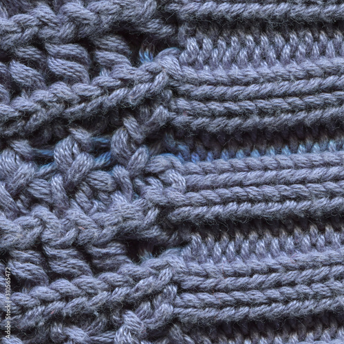 Blue knitted pullover background, close up. Knitted cloth texture of Princess Blue Color yarn. Fine-knit pure cashmere jumper. Soft blue angora background, closeup.