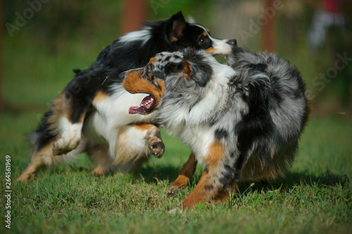 Blue merle and black tricolor australian sheperds are playing together in a natural park