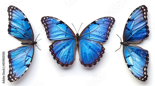 Blue morpho butterfly, isolated on a white background with a clipping path. A full-body photo of a blue-colored butterfly with its wings spread open. Two side view photos and a top view photo in the