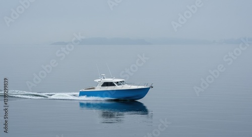 boat, motorboat, blue, water, sea, ocean, lake, vessel, nautical, marin, transportation, travel, recreation, leisure, sport, fishing, cruising, wave, calm, peaceful, serene, misty, fog, horizon, coastline, coast, island, sky, nature, outdoors, summer, day, scenic, landscape, aquatic, tour tourism, journey, relaxation, vacation, holiday, adventure, exploration, speed, arousing, maritime