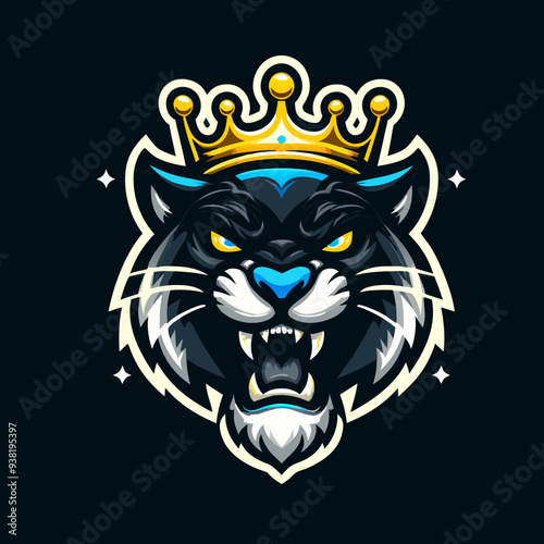 Blue Panther King with Crown Vector Illustration - Fierce Animal Mascot Logo Design , Royal Panther with Crown Graphic - Aggressive Blue Cat Emblem for Sports and Esports