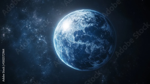 Blue planet view from space. Bright light above globe. Stars shine in background. Cold icy world in cosmos. Dark skies and light form an abstract view.