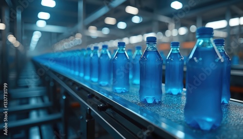 Blue plastic bottles move on conveyor belt beverage factory. Automatic bottling line. Liquid production, water manufacture process. Drink plant interior. Automated machinery, industrial equipment.