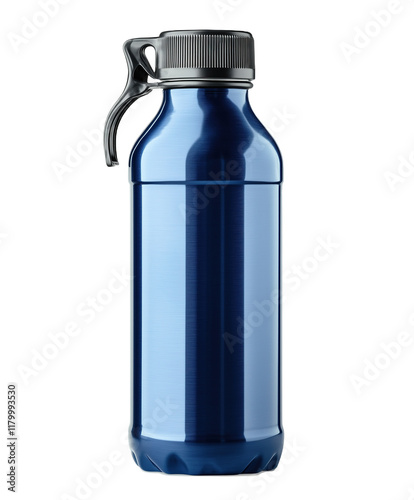 Blue plastic water bottle with handle and cap isolated on PNG cutout background