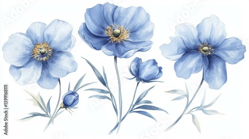 poppy, flower, blue, watercolor, floral, botanical, bloom, blossom, stem, leaf, foliage, white, background, isolated, nature, plant, spring, summer, delicate, elegant, soft, gentle, light, airy, hand-painted, artwork, drawing, decorative, invitation, greeting, surface, texture