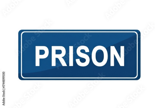 Blue rectangular sign with the word prison in white text, isolated on white background
