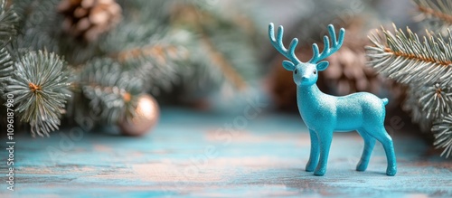 Blue reindeer toy ornament on a vintage background with Christmas decorations and foliage creating a festive holiday atmosphere