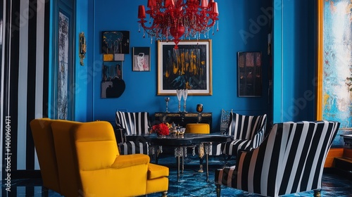 room, interior, design, chair, blue, luxury, home, decor, art, chandelier, furniture, striped, vibrant, elegant, stylish, apartment, house, living, space, modern, contemporary, yellow, black, white, opulent, rich, sophisticated, comfortable, relaxing, ambience, atmosphere, aesthetic, style, image, photo, background, wallpaper, texture, pattern, colours, lifestyle