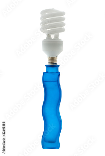 lamp, bulb, light, lighting, waterglass, glasses, vase, bowl, energy, environment, electricity, fluorescent, savings, conservation, blue, white, shaped, concept, object, 2, pair, composition, watt, idea, home, in, isolated