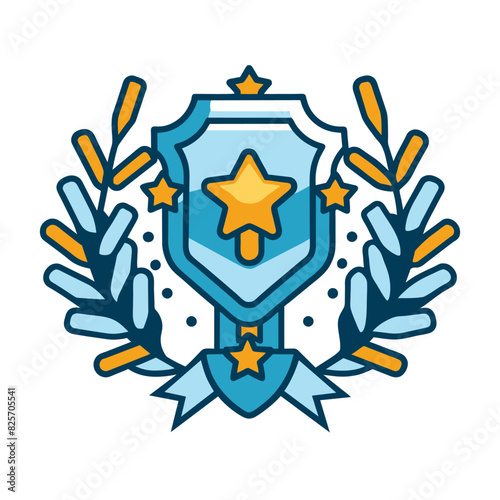 blue, shield, gold, star, laurel, chaplet, ribbon, award, achievement, honour, victory, champion, winner, success, triumph, excellence, recognition, distinction, prestige, glory, badge, emblem, symbol, icon, graphic, design, illustration, cartoon, clip art, isolated, white, background