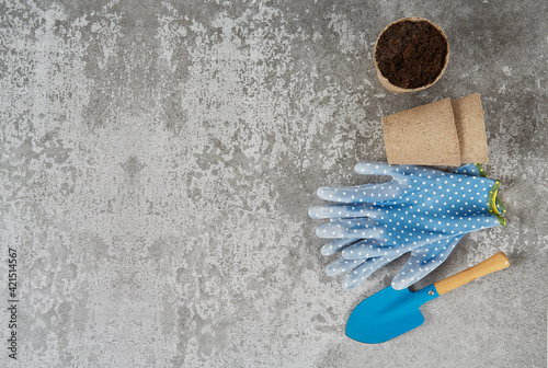 Blue shovel, garden gloves, pot with soil over grey cement surface. Planting concept.