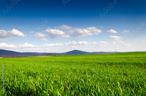 field, grass, sky, green, landscape, meadow, blue, nature, summer, agriculture, spring, cloud, cloud, land, horizon, rural, farm, lawn, countryside, sun, wheat, day, hill, country, plant