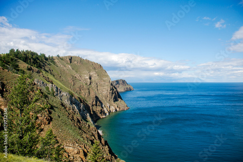 Blue sky with clouds over sea surface. Rocky coast view in sunny day