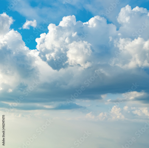 Blue sky with white clouds at sunny day. Abstract natural background with thick fluffy clouds