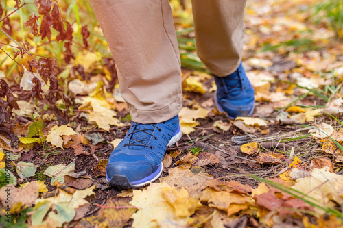 Blue sneakers walking on yellow leaves. Autumn sport and trekkin