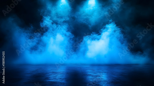 Blue spotlight and smoke on a stage, creating an entertainment background