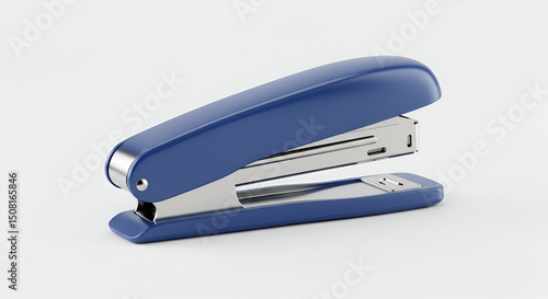 Blue stapler in a neutral setting. Object is angled, with a focus on the design details. Office supply for a general business professional.. Isolated on a plain background -