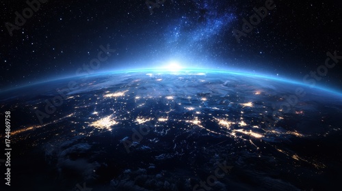 space, earth, planet, blue, sunrise, horizon, ray, sky, halo, view, stratosphere, nature, sunset, fantasy, sun, atmosphere, globe, black, big, global, sphere, background, star, galactic, universe, starry, sunbeam, beautiful, cosmos, peace, galaxy, environment, orbit, orbital, glow, light, sunlight, geography, exploration, night, astronomy, alien, science, astrology, expansion