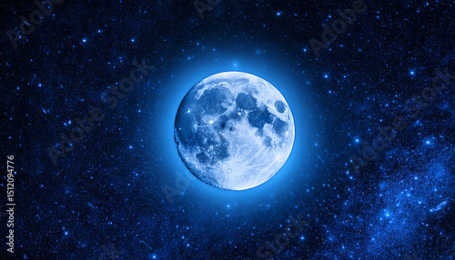 blue super moon glowing with blue halo surrounded by small stars on black sky background