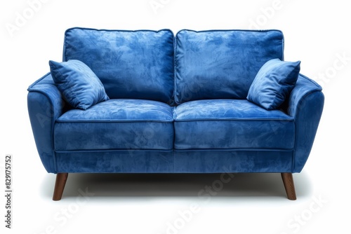 Blue velvet sofa with wooden legs on white background viewed from above and isolated