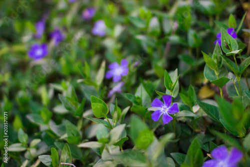Blue vinca (periwinkle) flowers on the background
