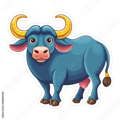water buffalo, buffalo, cartoon, illustration, animal, blue, yellow, horn, white background, farm animal, cute, clip art, vector, graphic, design element, happy, mammal, ungulate, bovine, agriculture, rural, countryside, nature, wildlife, fauna, art, drawing, digital artwork, simple, colourful, friendly, peaceful, icon, sticker, mascot, character, children, children, toddler, baby, watercolor, poster, greeting card, book cover