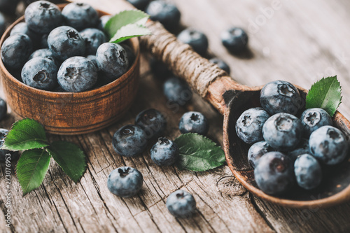 Blueberries in wooden spoon on old wood table. Healthy eating and nutrition concept.