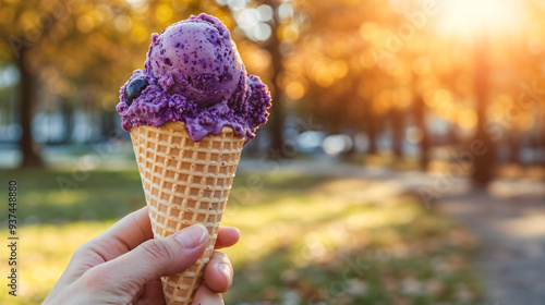 Blueberry ice cream cone held in hand, dappled park background, subtle golden light, autumn treat