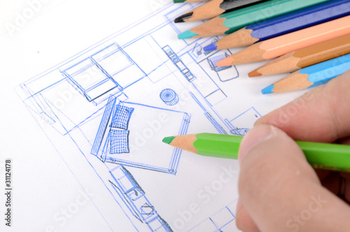 background, blueprint, choice, choose, colours, coloured, colours, copy, decorating, decorator, design, floor, yellow, orange, home, house, interior, isolated, layout, makeover, match, material, paint, palette, path, pen, crayons, plan, print, redecorate, remodel, renovation, room, sample, selection, space, strip, study, white, eraser, rubber, blue, bed, draw, drawing, hand, finger, hold