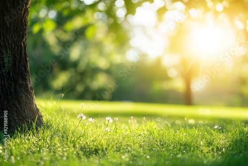 Blur background of sunlight shining though the tree with grass field. Soft light nature photography. Peaceful nature and solitude concept. with generative ai