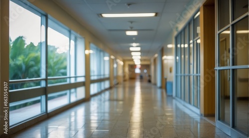 Blur image background of hospital clinic corridor empty hallway glass window ceiling door healthcare