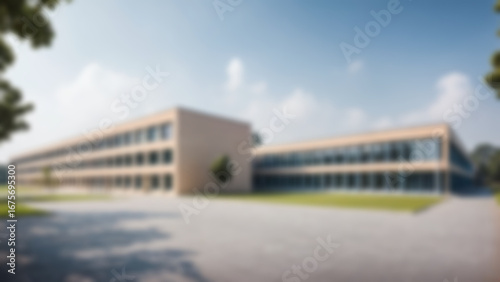 blur image of a modern high-rise school building, large yard, no trees blocking the way, blur wallpaper.