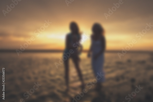 Blurred - young female homosexual lesbian family at sunset on the lake.
