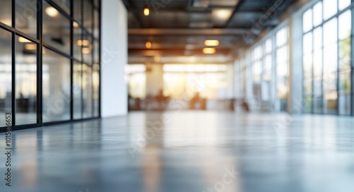 Blurred background of a modern office interior with glass windows and a polished concrete floor, providing ample copy space for text.