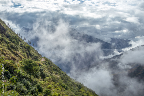 Blurred background with the cloud-covered mountain peaks of Apurimac river valley, Peru