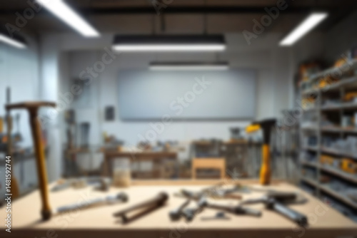 Blurred building shop, providing hammers and other building tools, modern theme with wood, good lighting, blurred building shop background.