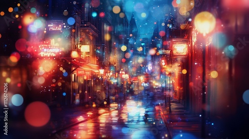 Blurred city street at night with lights and buildings, blurred bokeh effect, blurred background, blurred foreground, blurred cityscape, blurred urban scene