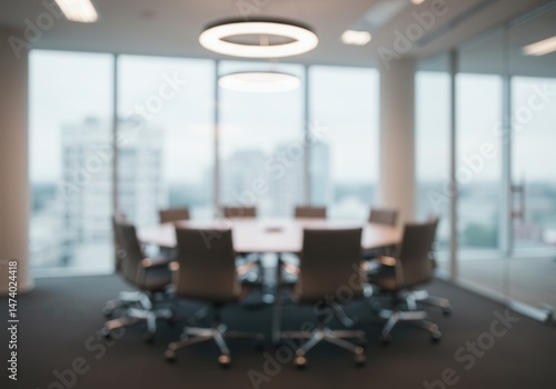 Blurred conference room with round table and chairs in front of large windows overlooking city buildings