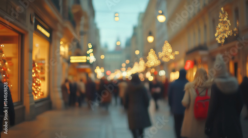 Blurred crowd of people enjoying festive winter atmosphere on a bustling city street in the evening