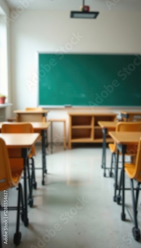 Blurred elementary school classroom, empty chairs and desks , school, building, defocused