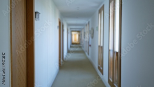 blurred, hotel, corridor, door, wall, defocused, hallway, bokeh, empty, interior, pathway, long, building, space, lighting, perspective, passage, indoor, aisle, window, vacant, structure, architecture, modern, clean, simple, peaceful, quiet, wood, design, symmetry, repetition, frame, abstract, soft, straight, narrow, light, ceramic, bright, direction, horizontal, linear, even, midday, leading
