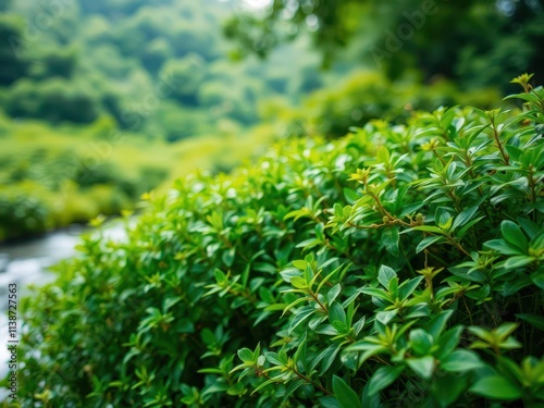 Blurred image of lush green plants and flowing water in a natural background, peaceful, landscape